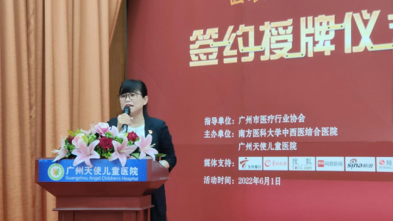 当天,广州市医疗行业协会秘书长许秋霞、南方医科大学中西医结合医院针推康复科周国平主任、南方医科大学中西医结合医院副主任杨路,广州天使儿童医院程旭生院长等领导和专家出席了授牌活动。