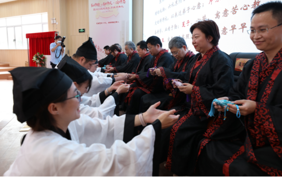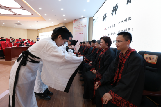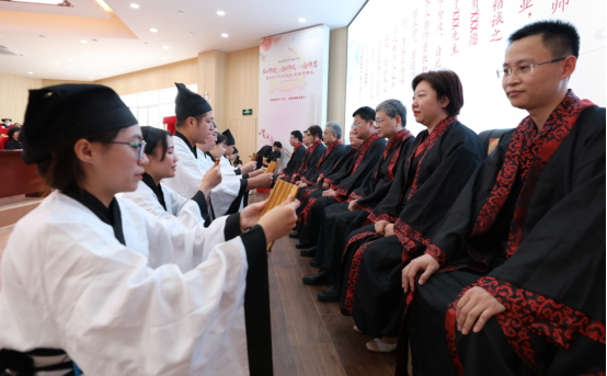 而后,开始了传统的一年一度的拜师典礼。拜师典礼现场,10名弟子向师承导师行跪拜礼、递交“拜师帖”,奉赠束脩六礼,呈敬礼茶,表达了对老师的敬意,答谢老师收于门下,也表明了自己发奋努力、立志继承老师学术思想的决心。