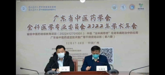 2022年12月17日,由广东省中医药学会、南方医科大学中西医结合医院主办,广东省中医药学会全科医学专业委员会、南方医科大学中西医结合医院治未病中心、事业发展部、科教科联合承办的“广东省中医药学会全科医学专业委员会2022年学术年会”在我院三九厅准时召开。受疫情影响,本次会议通过线上线下相结合的方式举办。本次会议共有 3000 余人次收看了线上大会的同步直播。