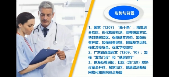 深圳市中西医结合医院朱美玲教授分享社区健康服务中心运营管理经验,重点强调绩效考核的重要性,从绩效方案的制定、调整、落实、宣讲四个方面,不断优化医院绩效考核方案从而促进医院精细化管理。张文安教授分享新十条形势下基层抗疫行动经验,介绍社区医院新形势下的工作七大法宝(发热门诊。应开尽开、简化就医流程提高工作效率、做好发热门诊患者分类管理、加强药品等紧急物资供应和管理、加强家庭医生主动服务、关系保护医务人员、网格布遍全市)。