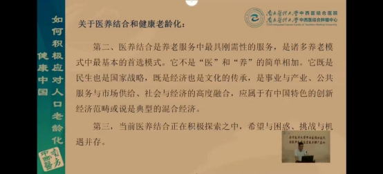南方医科大学中西医结合医院治未病中心廖荣鑫主任谈老年病中西医临证体会,介绍我国老龄化状况,结合健康中国战略,回答如何积极应对人口老龄化问题,阐述老年病、老年医学、中医老年病学的概念、特点,重点从老年病的分类、特点和用药原则三大方面谈临床体会。