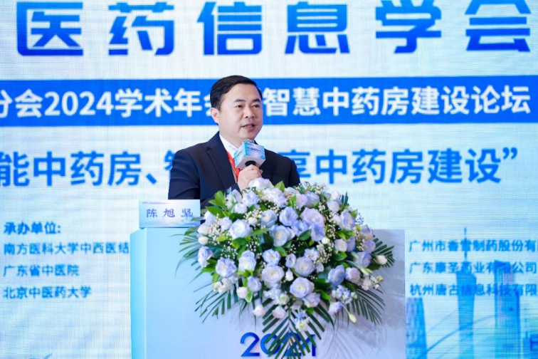 我院党委书记陈旭坚作为特邀嘉宾在开幕式致欢迎词。他指出本次大会旨在探讨如何利用大数据、人工智能等现代信息技术,优化中药房的资源配置,提升中药服务的效率与质量,实现中药房的智慧化转型与共享发展,意义重大,同时也希望中医药同仁加强沟通交流,共同为推进中医药信息化发展做出贡献。