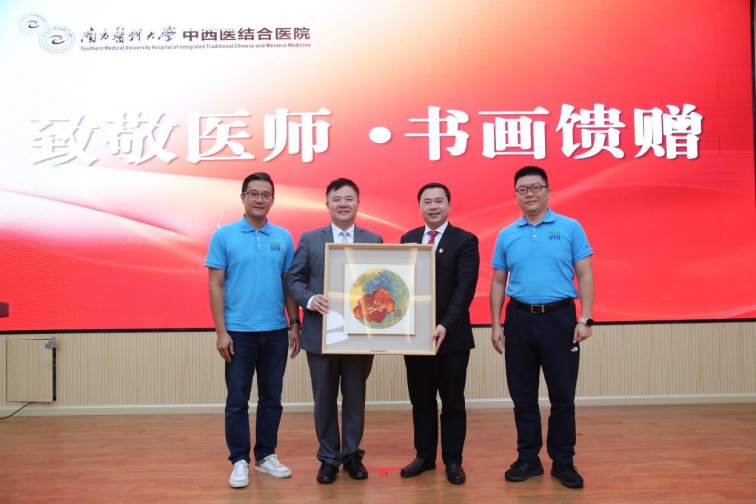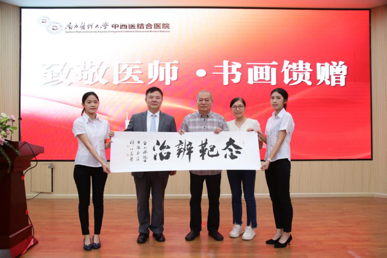 表彰会上,嘉宾向医生代表和医院馈赠书画,暖意洋洋,这个环节的安排还缘于一位“患友”的大爱。原来,广东省老干部书画诗词摄影家协会会长陈俊生近期正在医院和园(全科医学科)康养,他亲眼目睹医护工作人员的辛苦与付出,作为艺术家的他敏觉地想到要在医师节为大家做点什么,于是他想到邀请同行来院开展一场挥毫送墨活动,以实际行动向医务工作者表达敬意。他的想法得到同行积极回应,同时也得到广东潮青会的热情响应,于是有了这场别开生面的翰墨丹青礼。