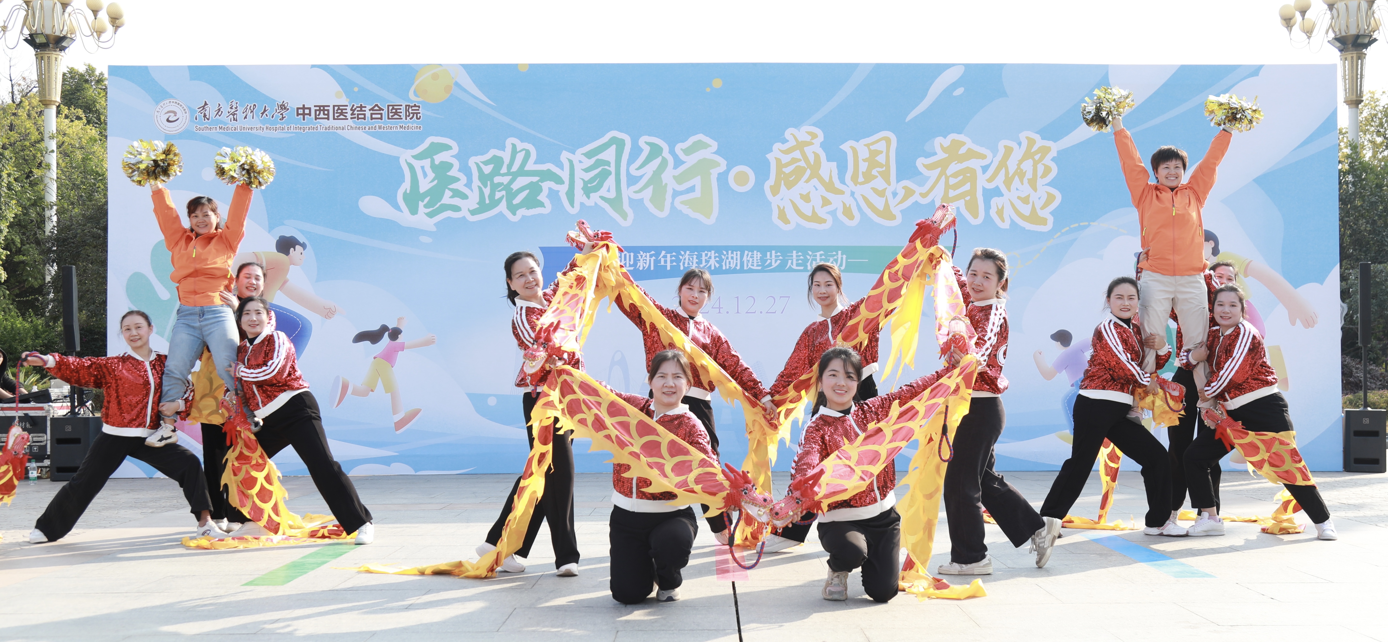 12月27日下午,冬日暖阳下一场别开生面的活动在海珠湖北广场热烈展开,活动以幼儿园老师们表演的《龙舞飞扬啦啦秀》热身舞点燃了现场气氛。这是南方医科大学中西医结合医院组织的“医路同行,感恩有您”迎新年海珠湖健步走活动,由党委书记陈旭坚领队,全院400余名师生员工参加,活动内容丰富,包括拔河比赛、集体生日会、健步走、健康义诊等。团委负责人吴佳仪担任活动主持。