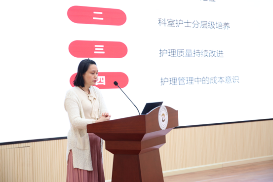 三名护士长分别分享管理经验。钟伟丽护士长凭借多年的从业积淀,从护士长角色定位、科室护士分层级培养、护理质量持续改进、护理管理中的成本意识四个方面分享自己从业多年的感悟与思考。刘娟护士长以心血管科护理单元的科室管理为切入点,结合实际案例,分析在护理团队、护理质量、患者安全、护理服务优化、医护团队协作等方面的实践经验。党桂宁护士长围绕科室运营管理,分享了运营管理的背景、运营管理的实施策略以及对运营管理的展望,呼吁全院护理人员转观念、强培训、优流程、重细节、精考核、严质控,携手提升科室运营效率。