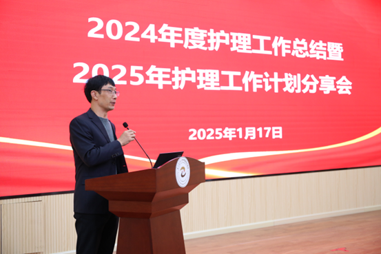 最后,杜庆锋院长发表了总结讲话。他对护理团队在2024年所取得的成绩给予了高度评价和充分肯定,对全体护理人员的辛勤付出表示衷心的感谢。杜院长强调,随着医院不断发展壮大,选贤任能至关重要,他期望有能力的护理人员能迅速融入核心团队,为医院发展贡献力量。在医院改革进程中要秉持“破中有立”的理念,灵活运用“以案促改”和“试点先行”的策略。此外,医院要积极打造中西医结合临床护理学科,在此过程中强化质量管理与运营管理,充分发挥中医特色优势,为医院发展注入强大动力。