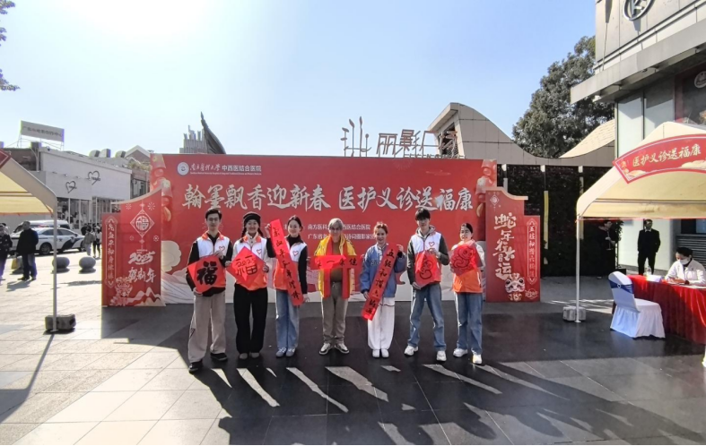 翰墨迎春,金蛇贺岁。在春节即将来临之际,为弘扬中华优秀传统文化,关心社区市民,提升公众的健康意识,南方医科大学中西医结合医院携手广东省老干部书画诗词摄影家协会于1月18日上午,在海珠区丽影广场举行“翰墨飘香迎新春,医护义诊送福康”惠民活动。南方中西医陈旭坚书记、书画协会会长陈俊生会长、李锐文副会长、石先进常务理事、余定军名誉会长、孟大东顾问、吴寿良老书法家、李新香办公室主任参加了活动,活动由团委负责人吴佳仪主持。