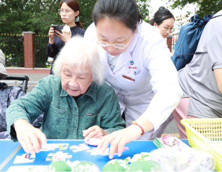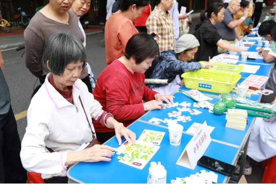 94 岁的周奶奶退休前也是一名医者,退休后深居简出。此次听闻活动消息,在军休十三所干部组织下,她欣然参与趣味游园。在药物拼图活动中,老人手持金银花、石斛等药材模型,在欢声笑语中拼出养生图谱,既活动了手脚,又锻炼了大脑思维,脸上满是笑意。