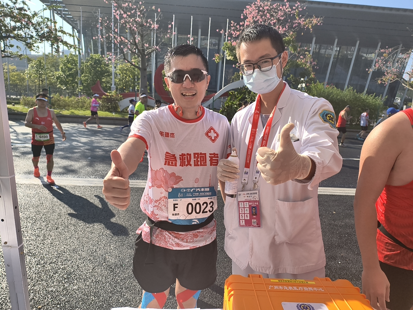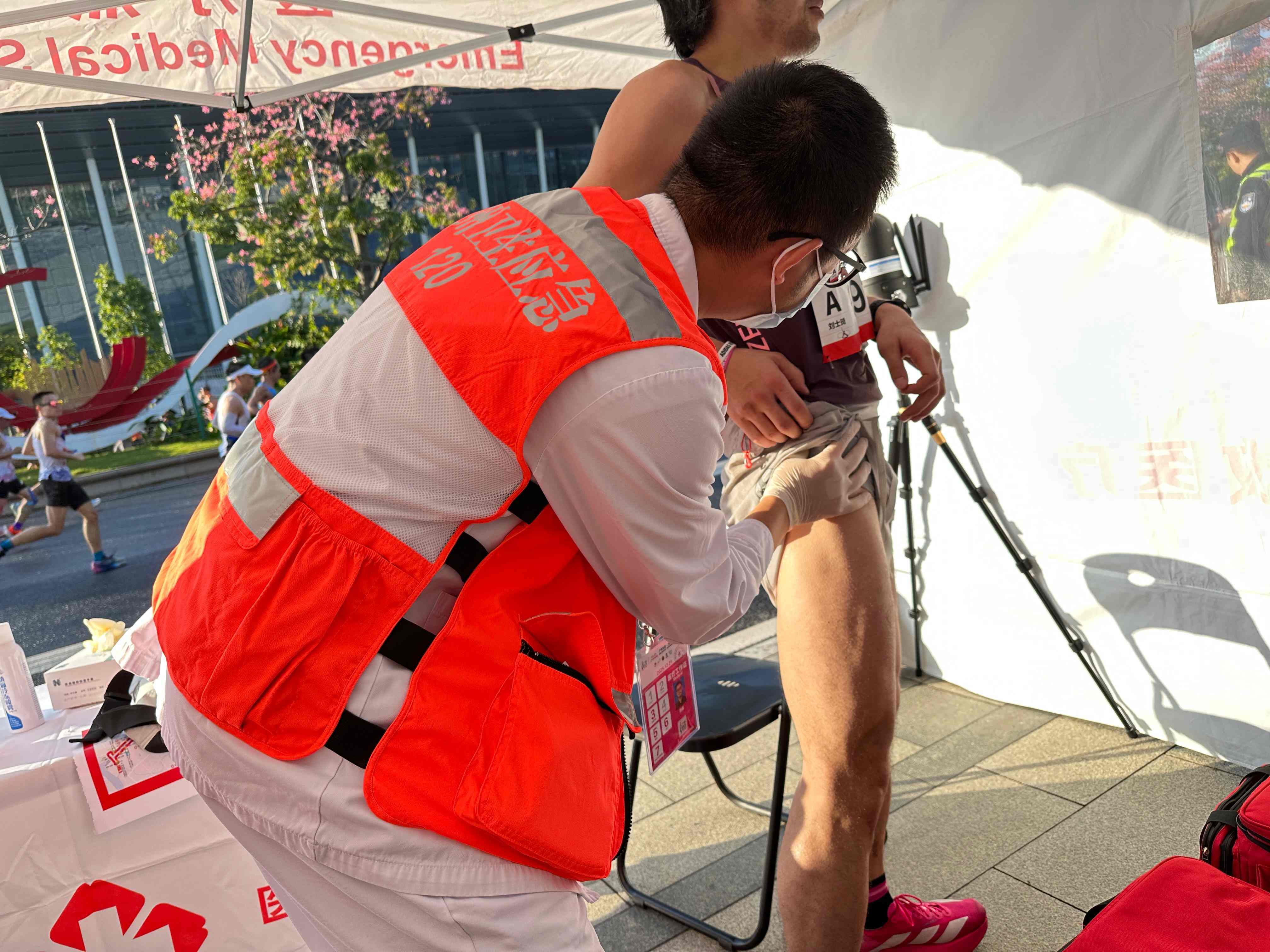 中午11:30,17号医疗点位保障任务结束,团队转场至天河体育中心终点区域继续值守。期间一名青年选手冲线后因过度换气突发呼吸急促、手脚发麻症状,医护人员立即将其带至医疗帐篷,采用呼吸调节法指导其缓慢深呼吸,并给予面罩吸氧。8分钟后选手症状缓解,生命体征恢复平稳。