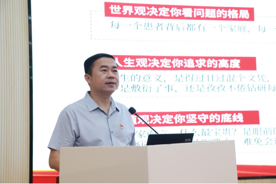为引导青年医学人才坚定职业初心、涵养医者情怀,4 月 8 日下午,南方医科大学中西医结合医院 2026 年春季学期“思政第一课”在学术会议厅开讲。医院党委书记陈旭坚以“树正确政绩观,修时代大医精诚”为主题,为青年学子讲授专题思政课。副院长黄少慧主持活动,医院2024级、2025级专业学位硕士研究生及住院医师规范化培训学员共 150 余人参加学习。