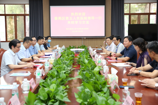 2022年7月6日下午,番禺区第五人民医院党委书记、院长蔡云峰等有关领导及科室负责人一行来南方医科大学中西医结合医院交流、探讨医联体合作有关事宜。我院彭康副院长以及相关科室负责人参加会议..