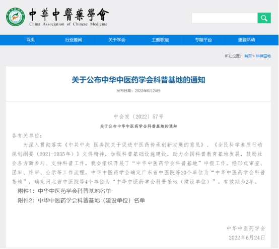 近日,我院申报的中华中医药学会科普基地,经形式审查、函审、终审、公示等工作流程,从96家申报单位中,脱颖而出,成功被确定为20家科普基地之一。