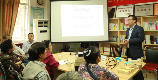 24日上午,由南方医科大学中西医结合医院主办、海珠区金星社区居委会协办的“进社区,送健康”系列公益活动在金星社区文化室举办,30名社区居民代表聆听讲座并与专家互动咨询。医院李爱民副院长..